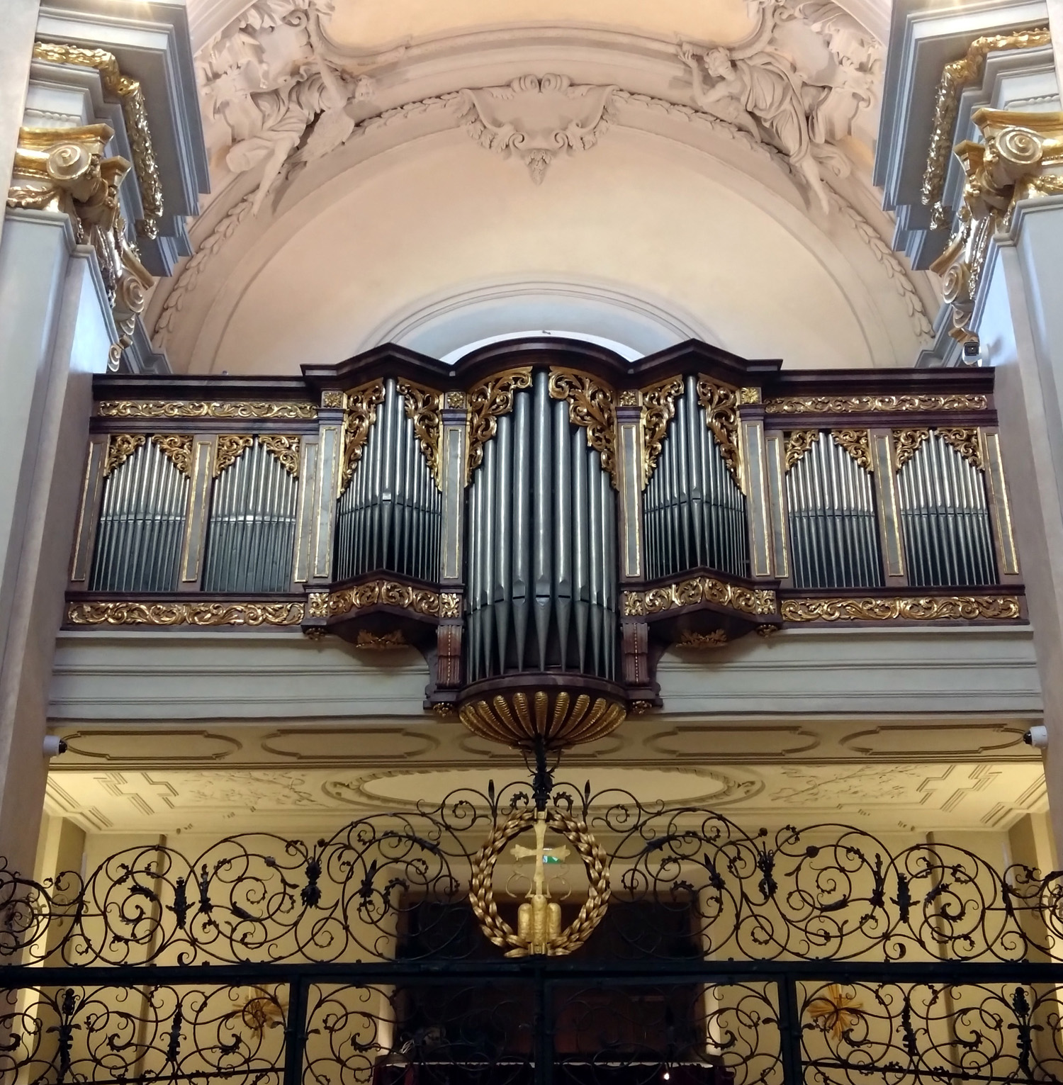 Brüstung laufen mitten durch das Orgelwerk hindurch. Hinter den drei