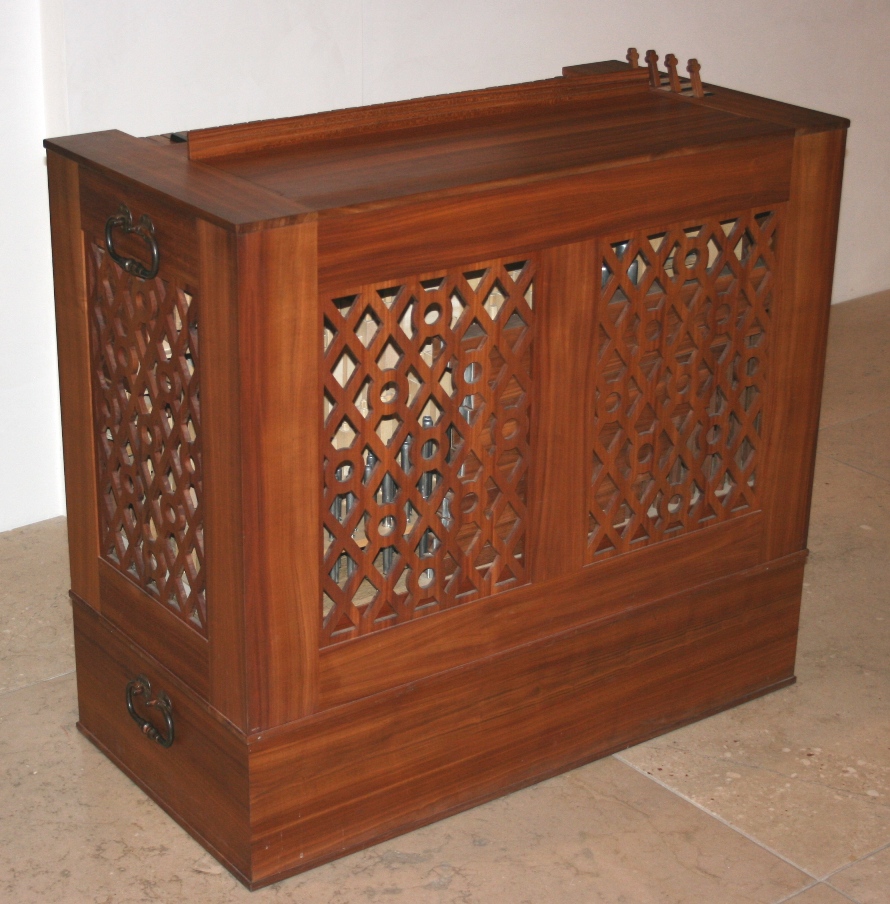 Die Truhenorgel ist einem Instrument von Gottlieb Näser (1734) im Germanischen Nationalmuseum Nürnberg nachempfunden. Die Register Copel 8´, Flöte 4´ und Principal 2´ haben Diskantvorabzüge: bei halb gezogener Schleife erklingen die Register nur ab c'.